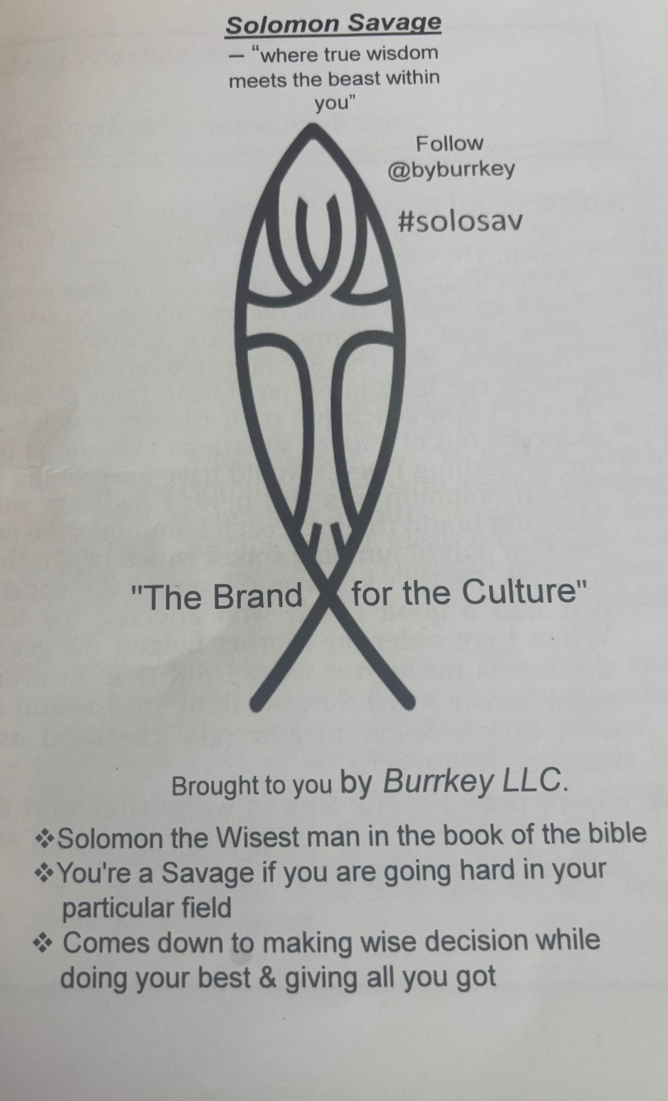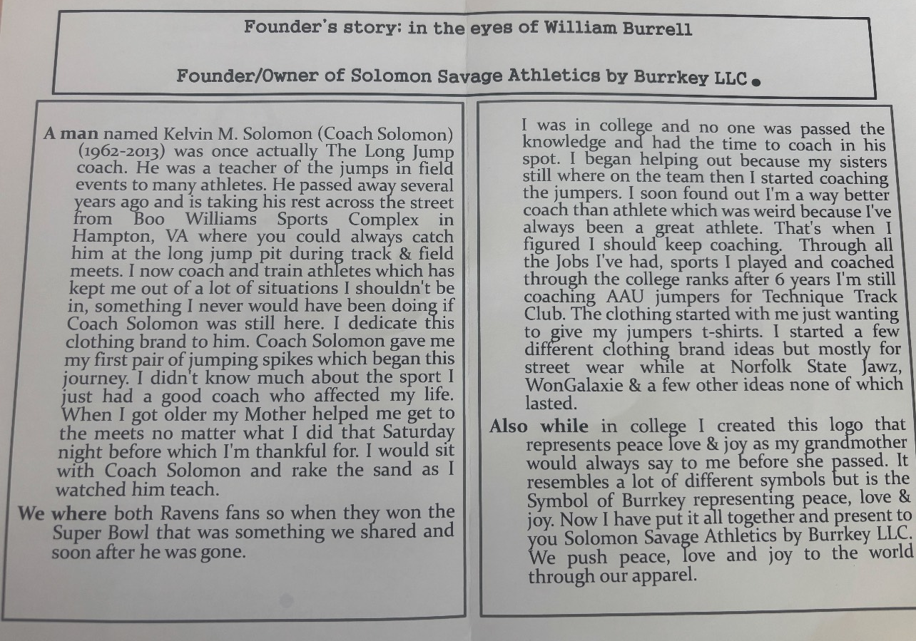 Founded in 2019 by Sir William N. Burrell, Solomon Savage is a brand that embodies the values of peace, love, and joy instilled by his grandmother. Initially focusing on custom vinyl designs, the brand faced challenges in gaining recognition. However, Burrell's determination shone through, especially during the setbacks of the COVID-19 pandemic, when he pivoted to producing masks and team apparel.
